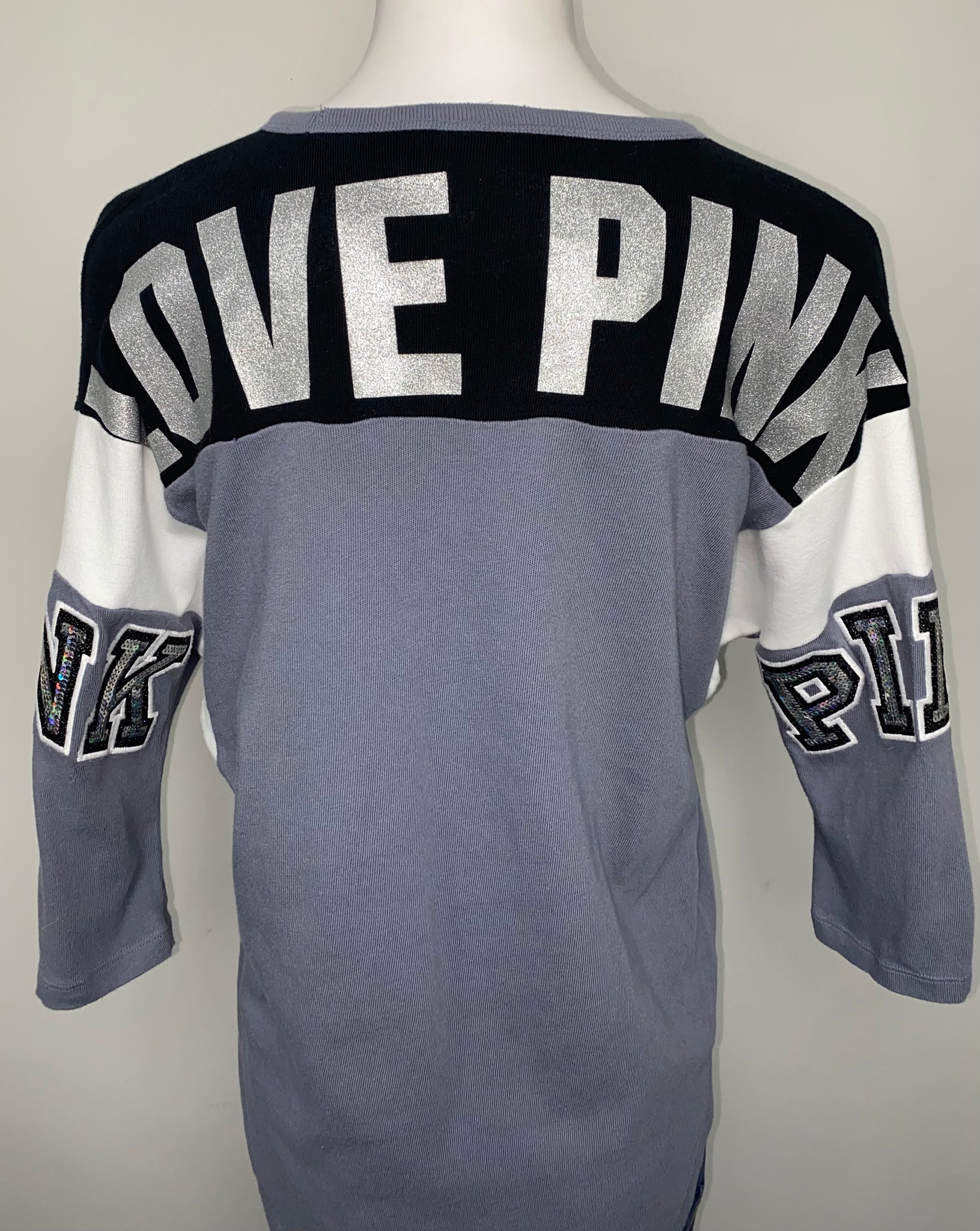 Colorblock dolman quarter sleeve, sequin/glitter graphic, excellent pre-owned condition!