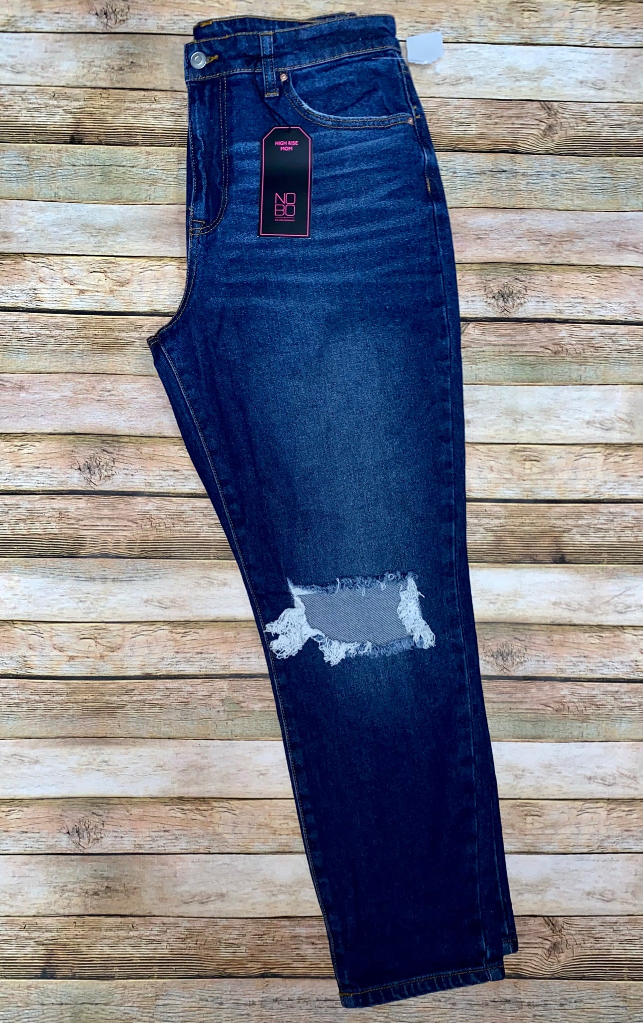Dark wash, distressed knees, high rise mom jeans. Condition is new with tags!